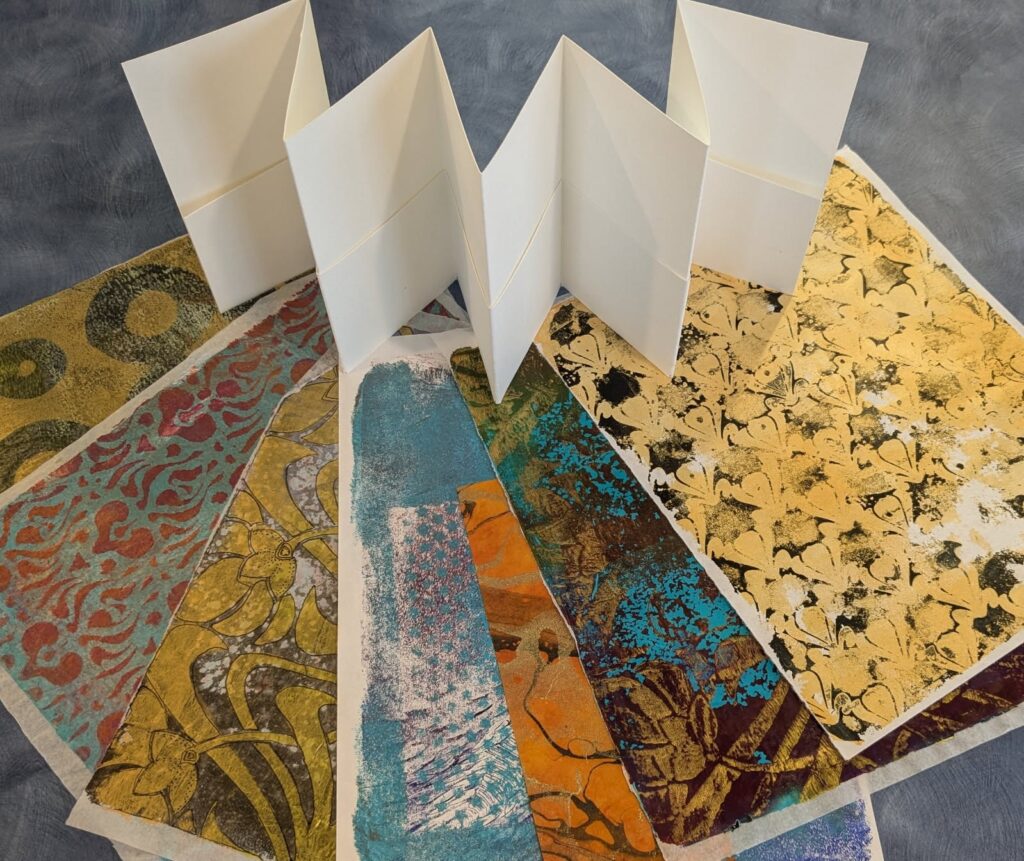 Join Dawn in covering a sheet of watercolor paper with collage elements (Nat Geo magazine photos, gel prints, old sheet music, old book pages etc.) and then using that sheet later to make a concertina or accordion style book. Cover options will also be discussed. There will need to be some drying time so collage elements will be left out during Camp for anyone to use.